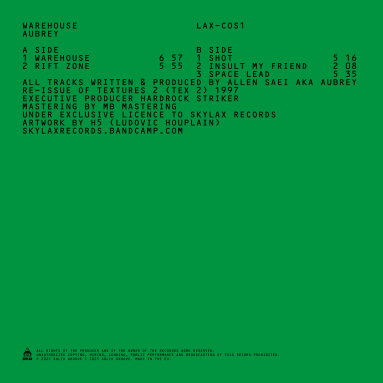 Skylax Records proudly presents the first release in our brand-new archival reissue project: the SKYLAX COLLECTOR'S SERIES. This collection is dedicated to unearthing rare and forgotten underground gems, pressed back to vinyl with love and respect for the original sound. We kick off this essential series with a deep cut from one of the UK’s most respected techno pioneers: AUBREY – WAREHOUSE, originally released in 1997 on his cult imprint Textures (catalogue: TEX2). This classic slab of wax features five tracks that masterfully blend deep house grooves with raw UK techno energy: A1. Warehouse / A2. Rift Zone / B1. Shot / B2. Insult My Friend / B3. Space Lead. Aubrey, real name Allen Saei, started his journey into music in 1990 under the alias Panic, with his first release Voices Of Energy on Sheffield’s Ozone Recordings, later licensed by Buzz in Belgium. That same year, he launched his first label Solid Groove Records, which went on to drop over 30 vinyl releases in 13 years, with tracks licensed and supported by heavyweights such as Derrick May, Carl Cox, Adam X, Pete Tong and Terry Francis. Aubrey also ran four additional underground labels: Textures, Dark, DOT and Cheap Knob Gags. A true lifer, he became a hip hop DJ at age 13, discovered acid house at 16 after hearing Mr. Fingers’ Washing Machine, and released his first vinyl at 17. By 18, he had a residency at Central Park in Portsmouth (a key spot that hosted the likes of Luke Slater, Carl Cox, Frankie Bones, Joey Beltram, Grooverider…), and quickly became a fixture in the UK rave circuit, playing regularly at London institutions such as The Astoria, Turnmills, The Gardening Club, The Pirate Club, and legendary events like Energy and Raindance. He also worked behind the counter at import store Razzles, one of the most important dance music shops in the South of England, before joining Luke Slater at Jelly Jam Records. In 1991, he created Solid Groove to push his unique production vision—a journey that continues today through releases on legendary techno labels such as Metroplex and Ostgut Ton. Still fully active and devoted to music—DJing, mastering, remixing, and working in record stores—Aubrey remains a cornerstone of the underground. This reissue has been carefully remastered from the original tapes, pressed with the utmost attention to quality. A vital release for collectors, DJs, and all lovers of true UK techno and deep house. Strictly limited. No repress. Just music.